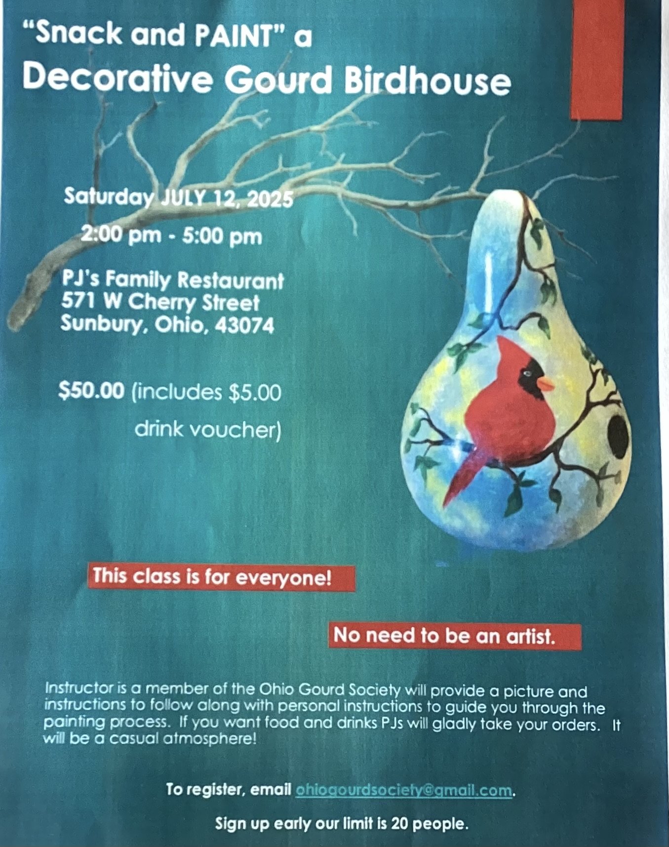 The instructor is a member of the Ohio Gourd Society.   She will provide a picture and written instructions to follow along with personal instructions to guide you through the painting process.  THE PATTERN IS ALREADY TRACED ON THE GOURD.     If you want food and drinks PJ’s will gladly take your orders.  The atmosphere is casual!.  This class is for everyone.   No need to be an artist!